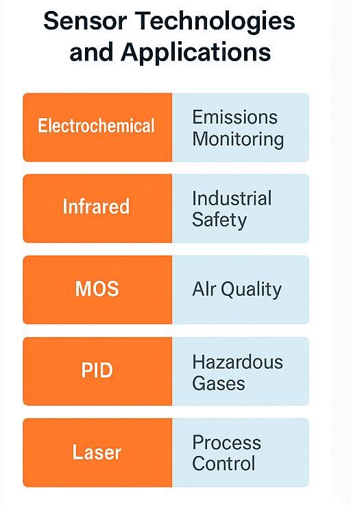 The report identifies diverse sensing technologies — electrochemical, infrared (IR), metal oxide semiconductor (MOS), catalytic, zirconia, photo-ionisation detection (PID), and laser-based methods.